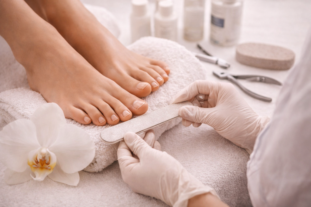 Gepflegte Füße für ein rundum gutes Gefühl – inklusive Reinigung, Pflege und auf Wunsch mit kosmetischer Verschönerung.